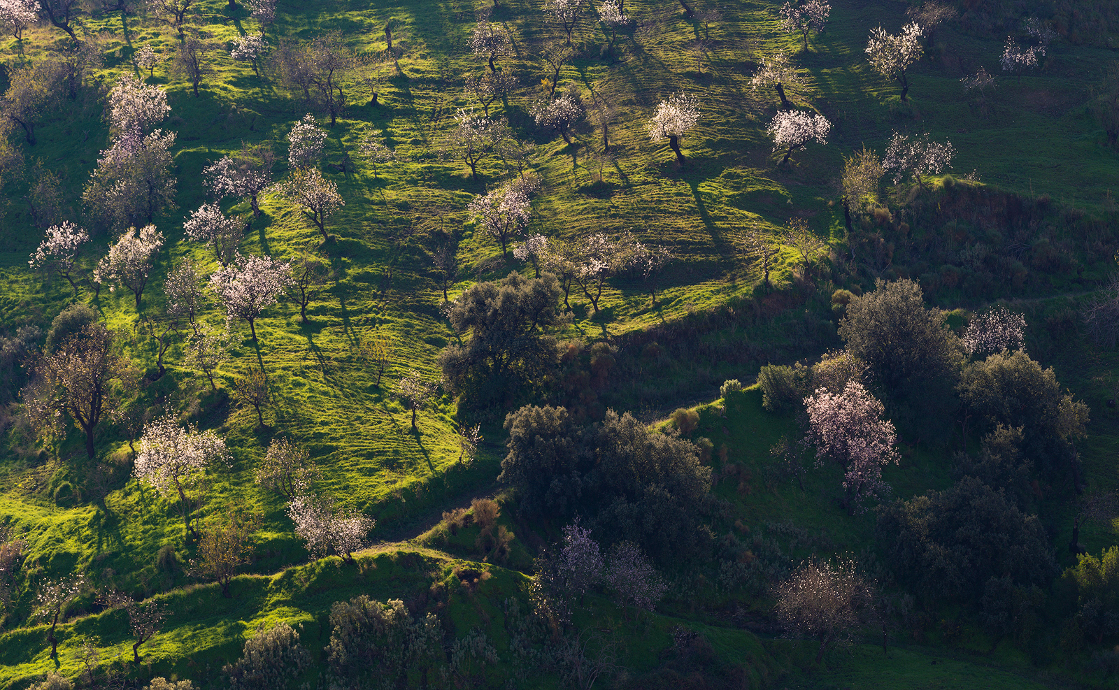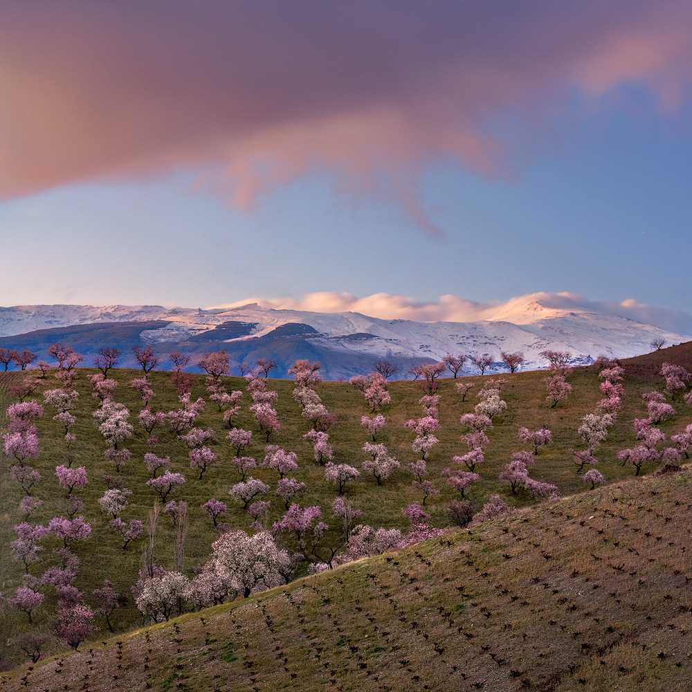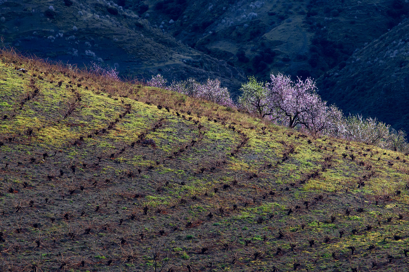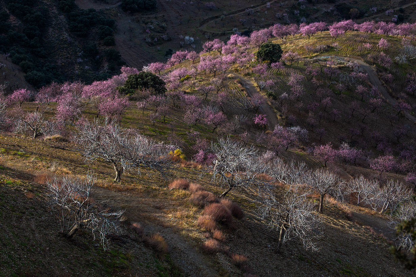 Cada invierno, cuando los demás árboles reposan paralizados por las bajas temperaturas y las escasas horas de luz, el almendro despierta y, antes incluso de desarrollar sus hojas, se cubre con sus espléndidas flores. Desde los meses de Enero y Febrero tenemos la oportunidad de disfrutar del maravilloso paisaje que ofrece la floración de los almendros en la Alpujarra baja – desde la Contraviesa a la Sierra de Lújar –. Los campos alrededor de pueblos como Cádiar, Torvizcón, Rubite, Murtas, Polopos o Sorvilán, se cubren con las llamativas flores de sus almendros, ofreciendo vistas únicas tanto hacia las nevadas cumbres de Sierra Nevada como mirando al mar Mediterráneo. Los almendros, junto a las vides y las higueras, han sido desde hace años, y siguen siendo, los principales cultivos de estos campos, y son también los que confieren su particular fisionomía a este paisaje agrícola. Los sectores ocres de los viñedos son atravesados por las perfectas líneas que dibujan las oscuras cepas, aún desnudas en el mes de Febrero, contrastando con la luminosidad y el colorido de los almendros en flor. Las higueras aparecen también en este paisaje, de forma más discreta, semejando espectros errantes con sus largas ramas desnudas y blanquecinas en esta época del año.