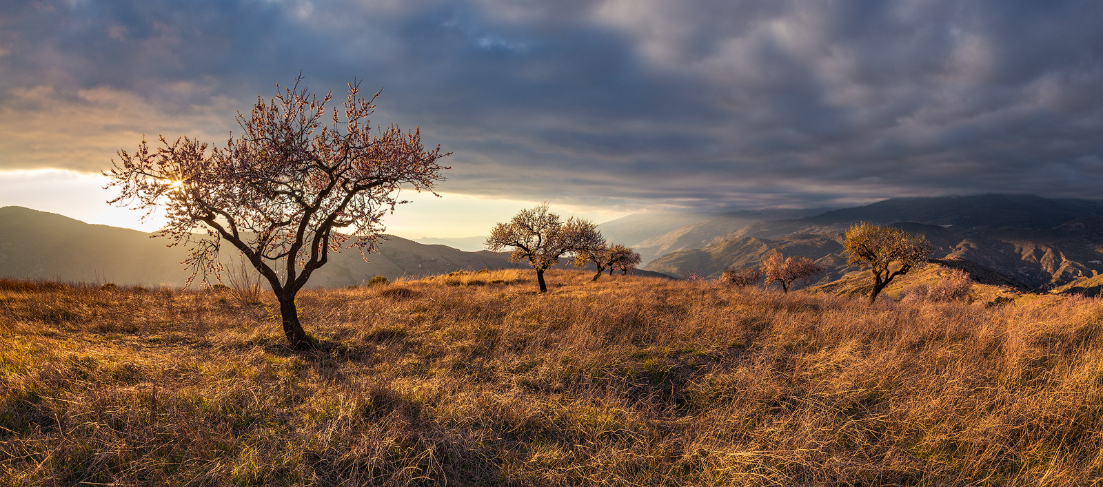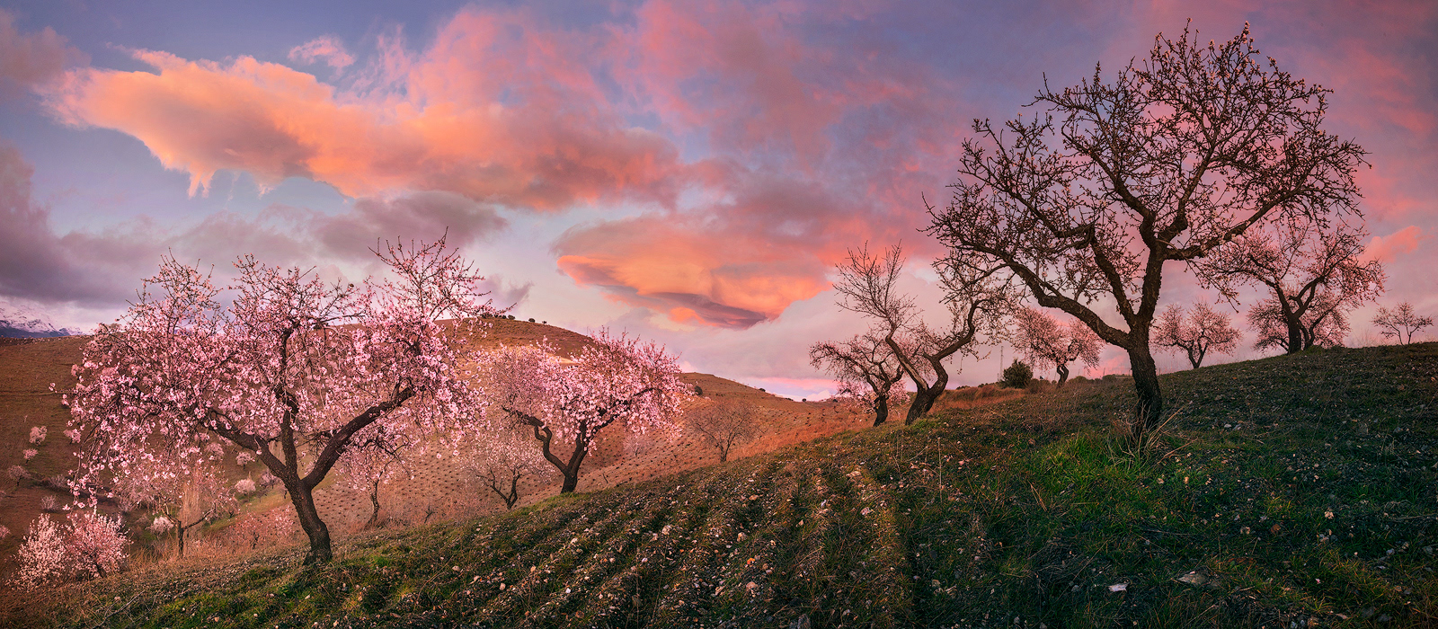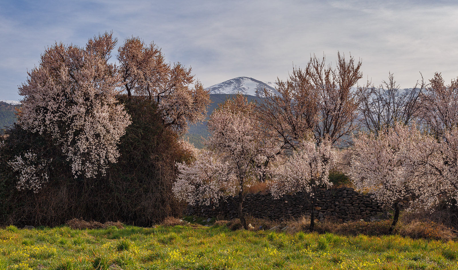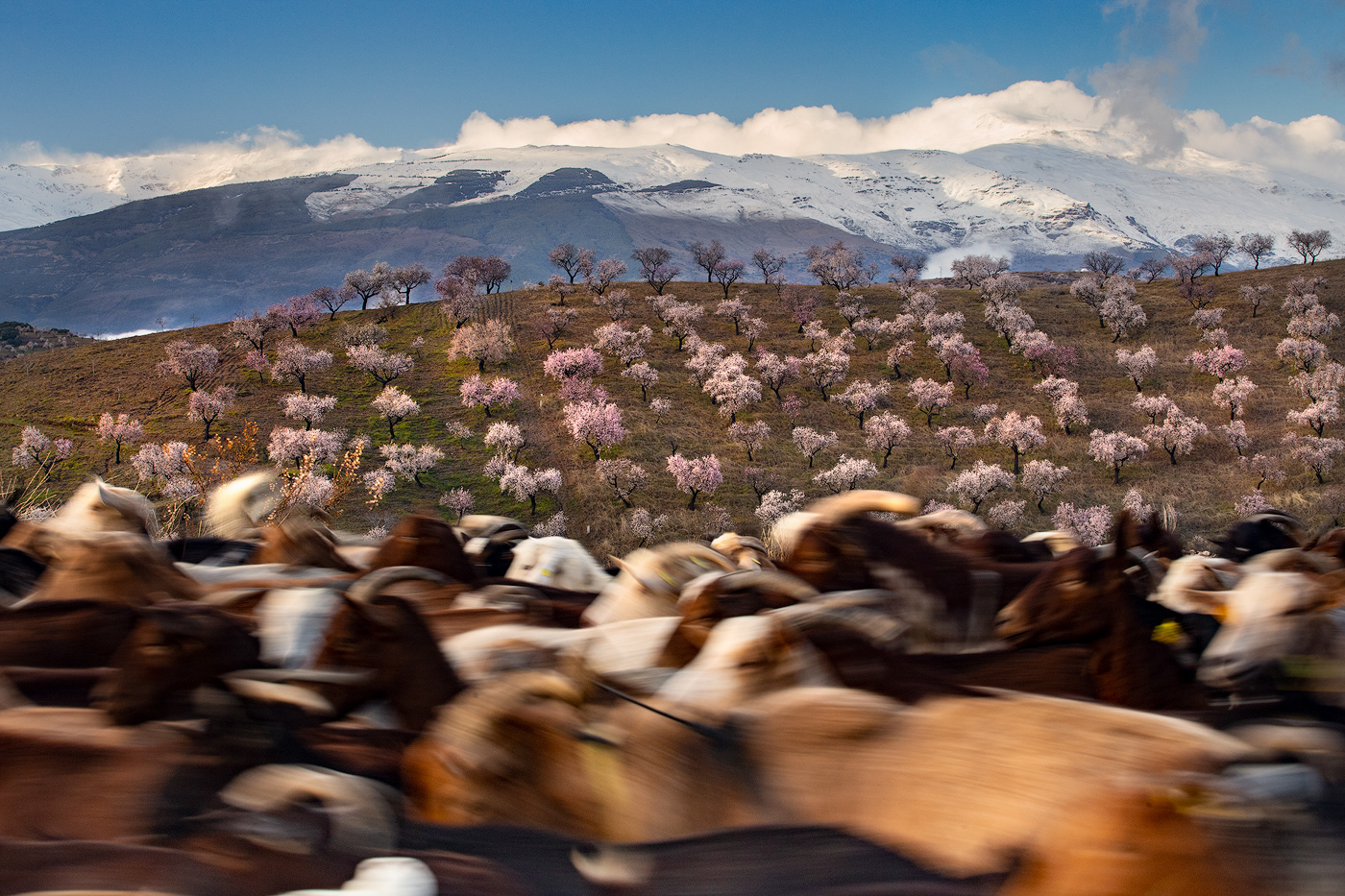 Cada invierno, cuando los demás árboles reposan paralizados por las bajas temperaturas y las escasas horas de luz, el almendro despierta y, antes incluso de desarrollar sus hojas, se cubre con sus espléndidas flores. Desde los meses de Enero y Febrero tenemos la oportunidad de disfrutar del maravilloso paisaje que ofrece la floración de los almendros en la Alpujarra baja – desde la Contraviesa a la Sierra de Lújar –. Los campos alrededor de pueblos como Cádiar, Torvizcón, Rubite, Murtas, Polopos o Sorvilán, se cubren con las llamativas flores de sus almendros, ofreciendo vistas únicas tanto hacia las nevadas cumbres de Sierra Nevada como mirando al mar Mediterráneo. Los almendros, junto a las vides y las higueras, han sido desde hace años, y siguen siendo, los principales cultivos de estos campos, y son también los que confieren su particular fisionomía a este paisaje agrícola. Los sectores ocres de los viñedos son atravesados por las perfectas líneas que dibujan las oscuras cepas, aún desnudas en el mes de Febrero, contrastando con la luminosidad y el colorido de los almendros en flor. Las higueras aparecen también en este paisaje, de forma más discreta, semejando espectros errantes con sus largas ramas desnudas y blanquecinas en esta época del año.