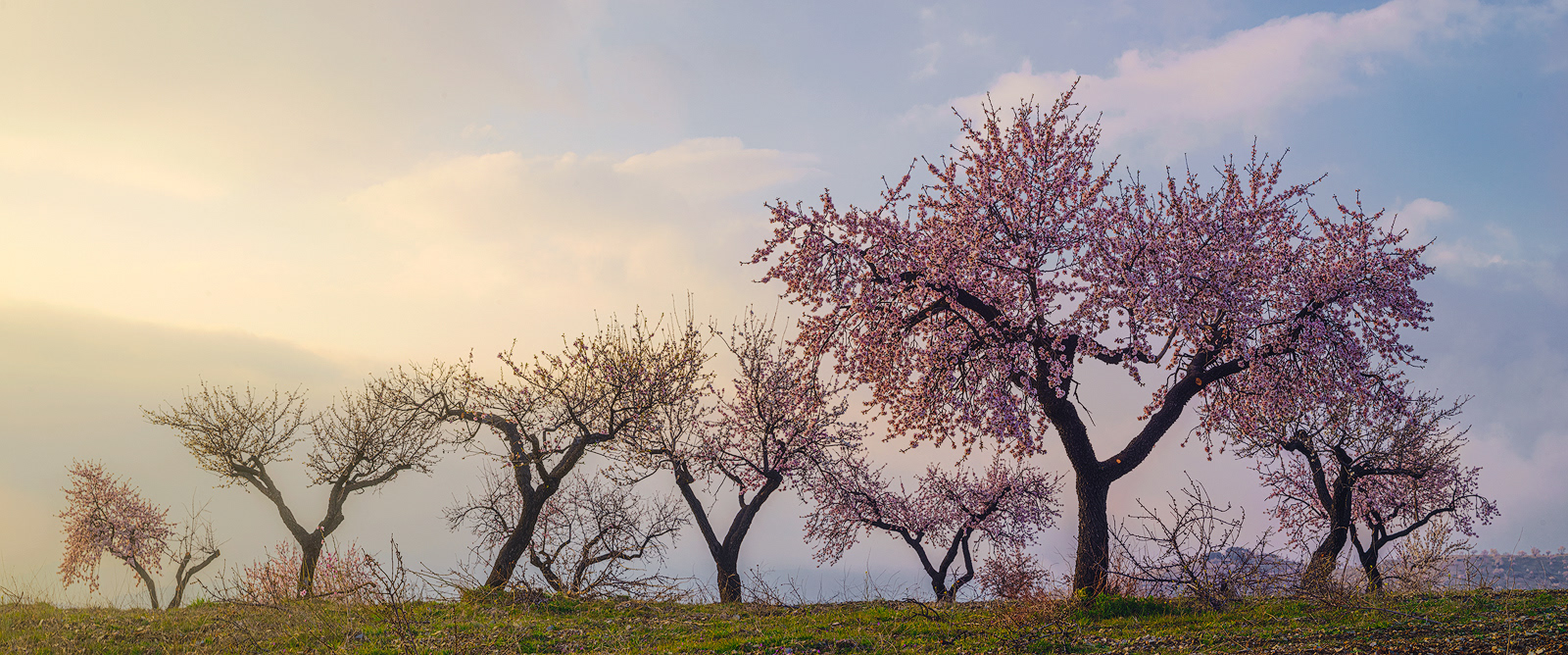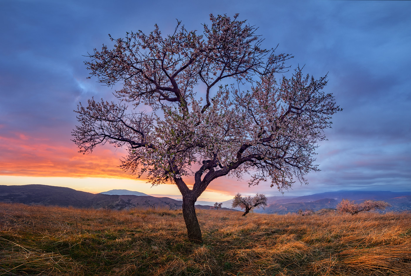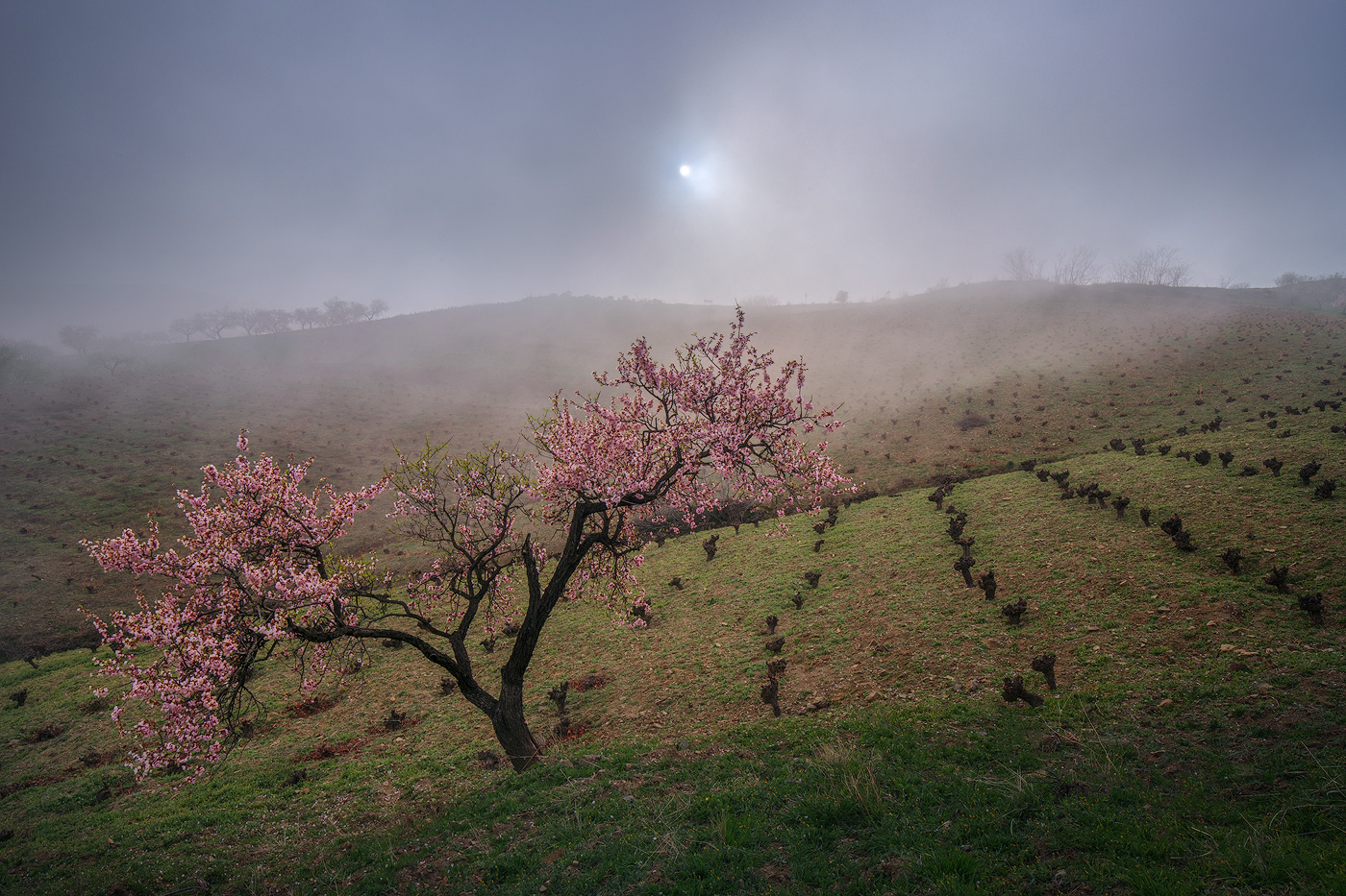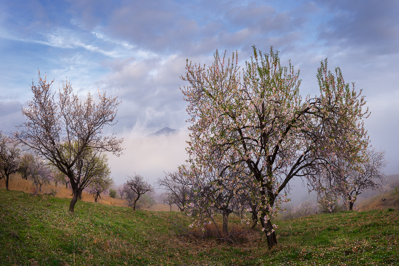 Cada invierno, cuando los demás árboles reposan paralizados por las bajas temperaturas y las escasas horas de luz, el almendro despierta y, antes incluso de desarrollar sus hojas, se cubre con sus espléndidas flores. Desde los meses de Enero y Febrero tenemos la oportunidad de disfrutar del maravilloso paisaje que ofrece la floración de los almendros en la Alpujarra baja – desde la Contraviesa a la Sierra de Lújar –. Los campos alrededor de pueblos como Cádiar, Torvizcón, Rubite, Murtas, Polopos o Sorvilán, se cubren con las llamativas flores de sus almendros, ofreciendo vistas únicas tanto hacia las nevadas cumbres de Sierra Nevada como mirando al mar Mediterráneo. Los almendros, junto a las vides y las higueras, han sido desde hace años, y siguen siendo, los principales cultivos de estos campos, y son también los que confieren su particular fisionomía a este paisaje agrícola. Los sectores ocres de los viñedos son atravesados por las perfectas líneas que dibujan las oscuras cepas, aún desnudas en el mes de Febrero, contrastando con la luminosidad y el colorido de los almendros en flor. Las higueras aparecen también en este paisaje, de forma más discreta, semejando espectros errantes con sus largas ramas desnudas y blanquecinas en esta época del año.